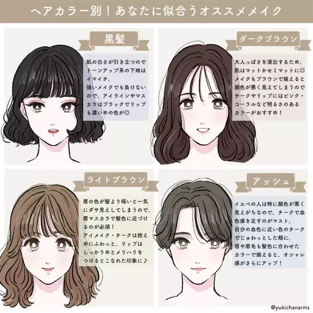 眉毛の色選びのは髪の毛 の色 明るいブラウンを使用すると、眉毛だけ目立ってしまい 顔がちぐはぐな印象になってしまうので注意! その他の髪色別の似合う眉色は? 茶色 自分の髪の色系統に合わせて、ワントーン明るい眉の色を選びましょう。 例イエロー系、アッシュ系、レッド